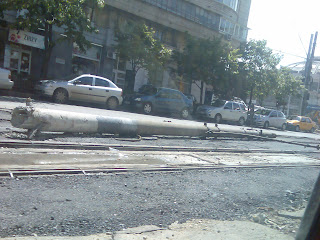 Tot pe lângă Unirii. Un stâlp doborât pe şinele de tramvai. Coafura rezistă.